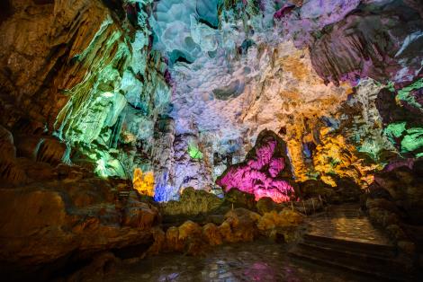 《驚訝洞》是《下龍灣》最大、最漂亮的天然鐘乳石洞,從下船處要登上50級階梯才會到達入口,當你氣喘呼呼同時,眼前千萬年累積形成的美景絕對讓你感到「驚訝」!《驚訝洞》分為前後區的中空鐘乳石洞,有千奇百怪的石柱、石筍,有的像動物、像神像,越往深處走,驚喜就越多!《驚訝洞》完美展現出大自然的鬼斧神工,搭配燈光,就好像置身在一個奇幻的異世界中。