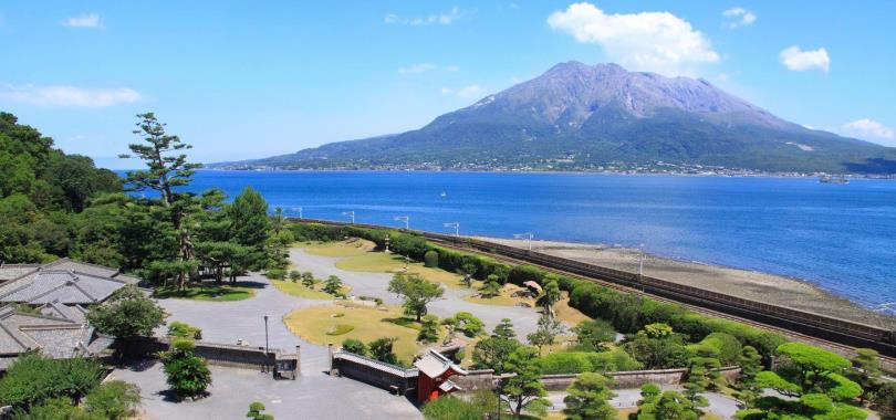 利用借景的手法在園內也可欣賞到矗立於錦江灣上雄偉美麗的櫻島景色,當時遠嫁德川將軍家的篤姬也實際在這美麗的庭園生活過。以櫻島為假山,錦江灣為池巧思設計,庭園景色壯麗讓人留連忘返,為鹿兒島最具代表的日式借景庭園。