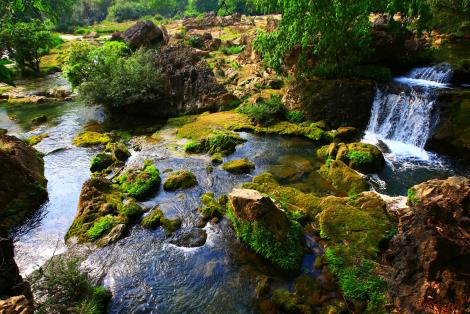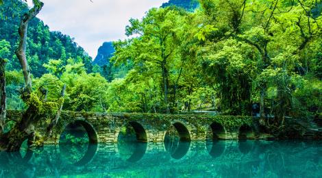 又稱為七姑橋,景區之名由橋而得。這是一座小巧玲瓏的七孔古石橋,昔為溝通荔波至廣西的重要橋樑。兩岸古木參天,巨大的虯枝沿著橋伸臂,宛如巨傘撐在橋上。