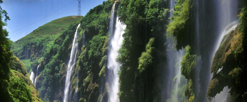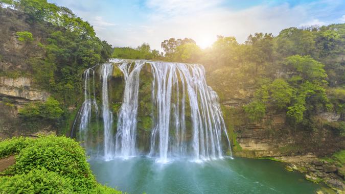 電視劇《西遊記》的取景地。黃果樹大瀑布因本地廣泛分佈著黃葛榕而得名,是世界著名大瀑布之一,以水勢浩大著稱。瀑布高度為77.8米,寬101米,屬喀斯特地貌中的侵蝕裂典型瀑布,鋪展在整個岩壁上,不失其闊而大的氣勢。