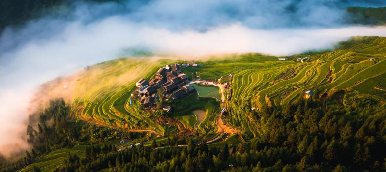 享有「雲在山間走,客在雲中游,梯田如指紋,景色冠九州」之美譽。梯田依山而開,隨山勢地形的變化而變化,靈動的曲線好似大地的指紋,常年霧氣縈繞,苗鄉特有的吊腳樓散落其間,猶如鑲嵌在青山綠水間的寶石,展現出和諧之美。