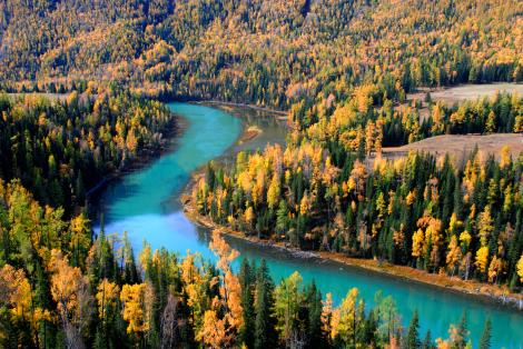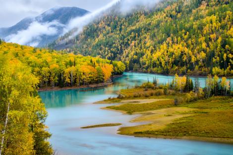 喀納斯國家地質公園北與哈薩克、俄羅斯接壤,東鄰蒙古,佔地895平方公里,公園內有喀納斯湖、神仙灣、月亮灣、臥龍灣等著名景點,集冰川、雪原、高山、河流、湖泊、森林、草原等自然景觀於一體,有「人間淨土」美譽。